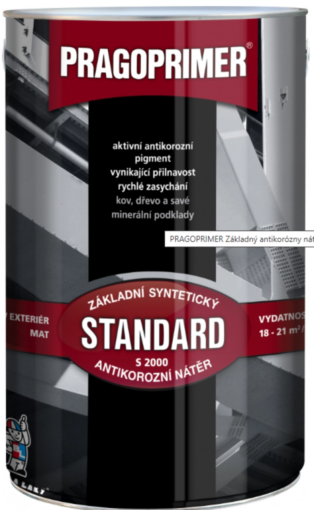 PRAGOPRIMER STANDARD S2000 je univerzálna základná farba na kov a savé podklady pre vnútorné aj vonkajšie prostredie, najmä pod syntetické a na vzduchu schnúce náterové hmoty, na nátery napr. plechových konštrukcií, strojov, kovového a dreveného nábytku a pod. Farba má vynikajúce antikorózne vlastnosti, veľmi rýchle zasychanie a univerzálnu aplikovateľnosť.